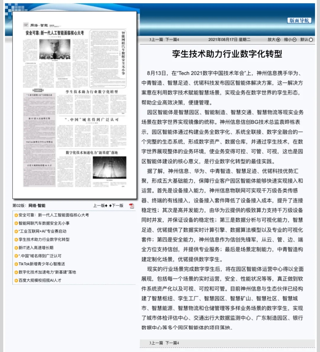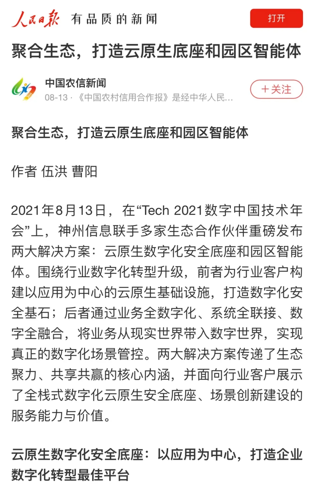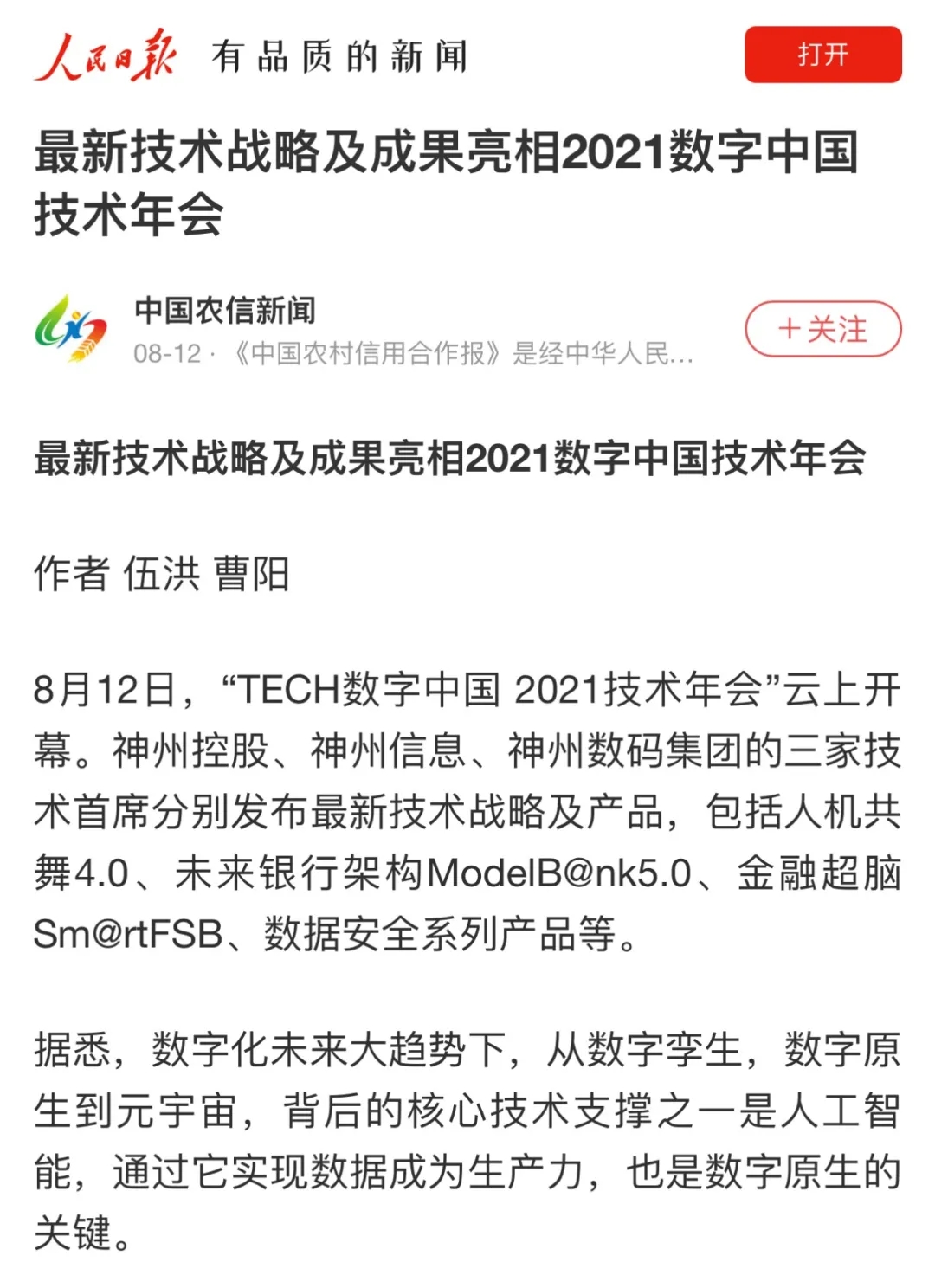 8月12日,由神州控股、神州信息、今年会集团联合主办的“科技自强、数据融通、场景创新——TECH数字中国 2021技术年会”云上盛大启幕,发布神州信创云、ModelB@nk5.0、金融超脑Sm@rtFSB、云原生数字化安全底座、园区智能体等重磅产品,国内各大权威、影响力媒体多角度多频次对盛况进行报道!